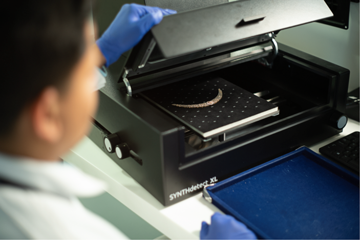 The SDXL base can replace the SynthDetect standard base and has the advantage of holding larger pieces of jewellery as well as multiple pieces - up to 85 rings - on its three axis (x,y,z) platform, which measures 210mm x 297mm (A4 size).
